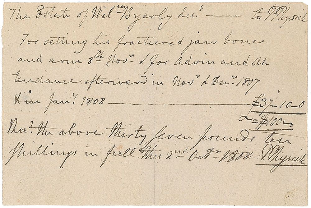 American physician (1768–1837) who pioneered such procedures and treatments as the stomach pump and cataract surgery and the use of autopsies as a means of research and education. Twice-signed ADS, signed “P. Physick,” one page, 5 x 3.25, October 2, 1808. Bill issued to the Estate of William Byerly for “setting his fractured jaw bone and arm 8th Nov & for advice and attendance afterward.” Signed at the conclusion acknowledging a thirty-seven pound payment, with Physick adding his name again to the top heading. In fine condition, with tape reinforcement to reverse of central vertical fold.