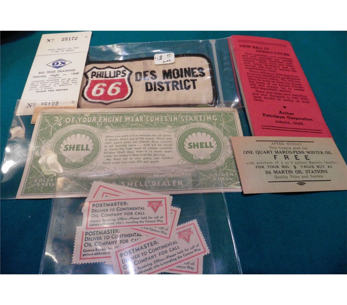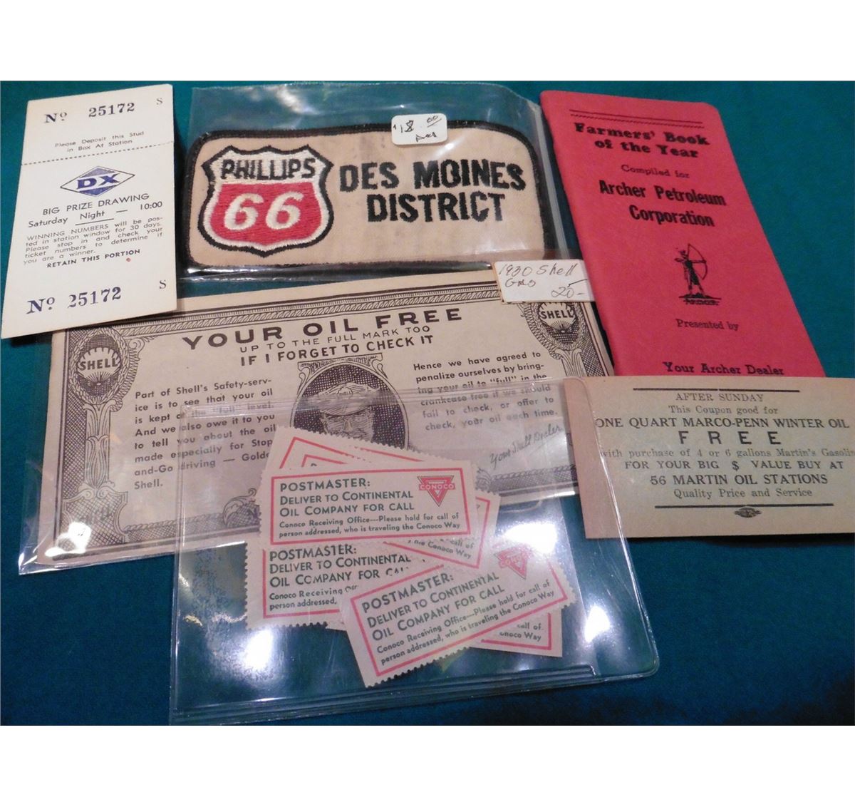 “Phillips 66 Des Moines District” cloth patch; “Farmer's Book of the Year (1947) Compiled for Archer Petroleum Corporation”; Scrip “One Quart Marco-Penn Winter Oil”; 1930 era “Your Oil Free up to Full Mark too if I forget to check it...” Scrip; “DX” Big Prize Drawing ticket, unissued; & (6) Conoco Oil Postmaster Stickers.