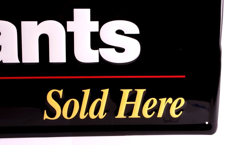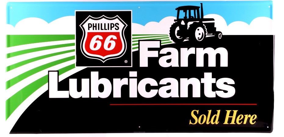 This is a Phillips 66 Farm Lubricants sign. The sign shows the Phillips 66 shield logo in red, white, and black along with the silhouette of a tractor. The sign reads "Farm Lubricants Sold Here". The sign is embossed aluminum with a rolled edge. The Phillips 66 sign is in good condition with great graphics. The sign measures 23.5" x 47.5".