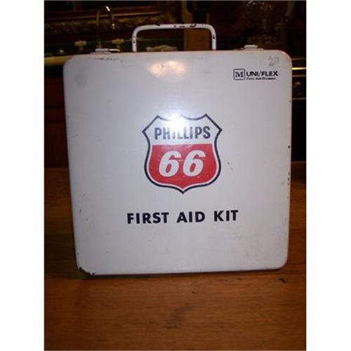 This is a metal Phillips 66 First Aid Kit that can be mounted on the wall.In very good condition and would be great for a bathroom or shop.I believe this is from the 1970s as there is a zip code on it.