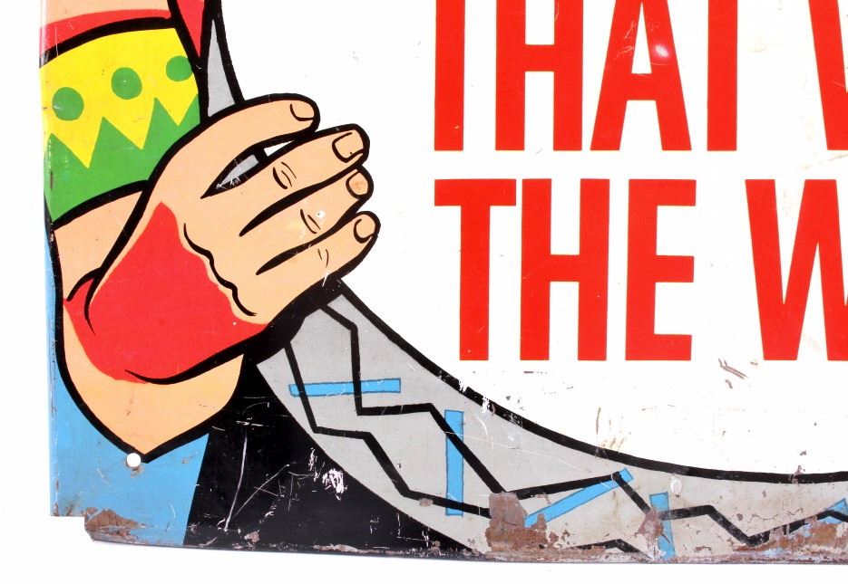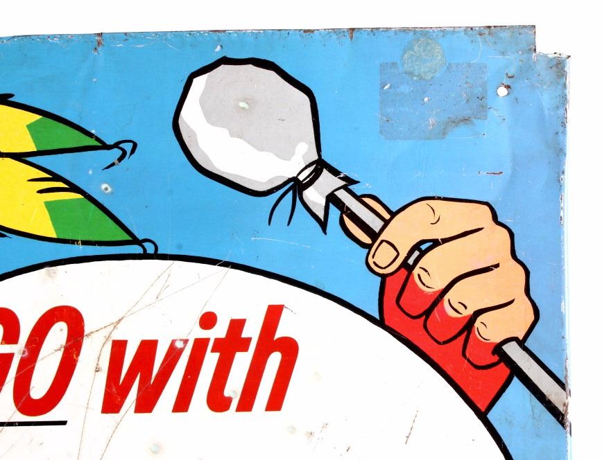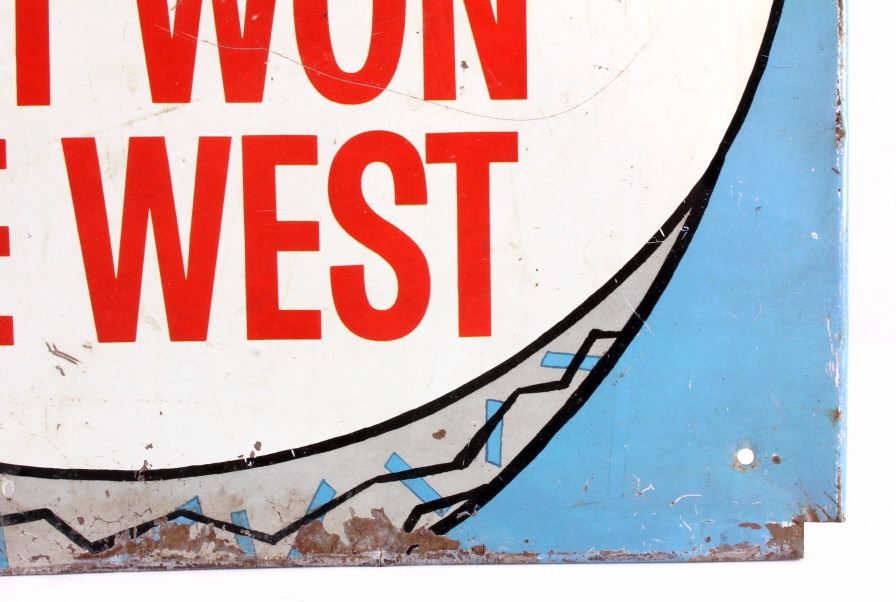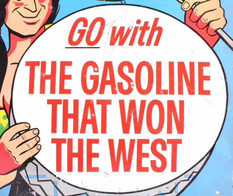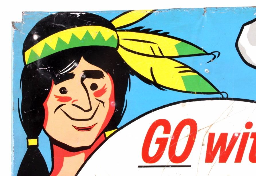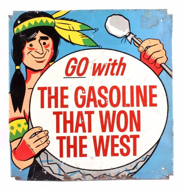 This is a Phillips 66 advertising sign. The sign shows the image of an Indian with his drum and reads "Go With The Gasoline That Won The West". The sign shows good overall condition with minor wear and damage as shown. The sign measures 15.5" x 16".