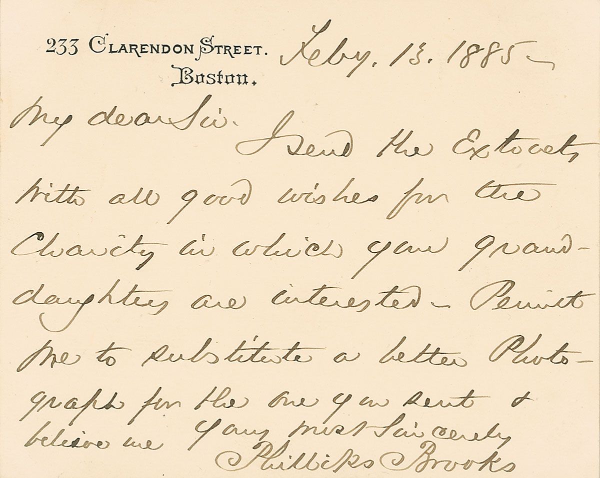 ALS, one page, 4.5 x 3.5, personal letterhead, February 13, 1885. Letter to a gentleman. In full: “I send you the Extracts with all good wishes for the Charity in which your granddaughters are interested—Permit me to substitute a better Photograph for the one you sent.” In very fine condition. Accompanied by an unsigned original cabinet photo of Brooks.