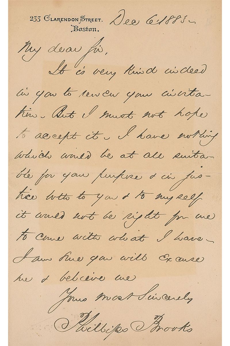 ALS, one page, 5 x 7.75, personal letterhead, December 6, 1885. Letter to a gentleman. In part: “It is very kind indeed in you to renew your invitation. But I must not hope to accept it…I have nothing which would be at all suitable for your purpose.” Removably encapsulated in a Mylar sleeve. A light block of toning over the main text, otherwise fine condition.