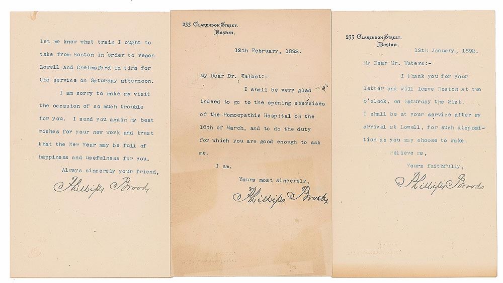 American clergyman (1835–1893) best known as the lyricist of the popular Christmas carol 'O Little Town of Bethlehem.' Collection of three TLSs by Phillips Brooks, totaling four pages, 4.75 x 8, Clarendon Street letterhead, dated throughout 1892. The first, in part: "I shall be at your service after my arrival at Lowell, for such disposition as you may choose to make." The second, in part: "I shall be very glad indeed to go to the opening exercises of the Homeopathic Hospital on the 16th of March." The third, in part: "As your train to Lowell comes back so late, I think I should prefer to drive to Chelmsford and return. If you could engage me a carriage at Lowell, I should count it a great favor." In overall very good to fine condition, with irregular toning to one of the letters.