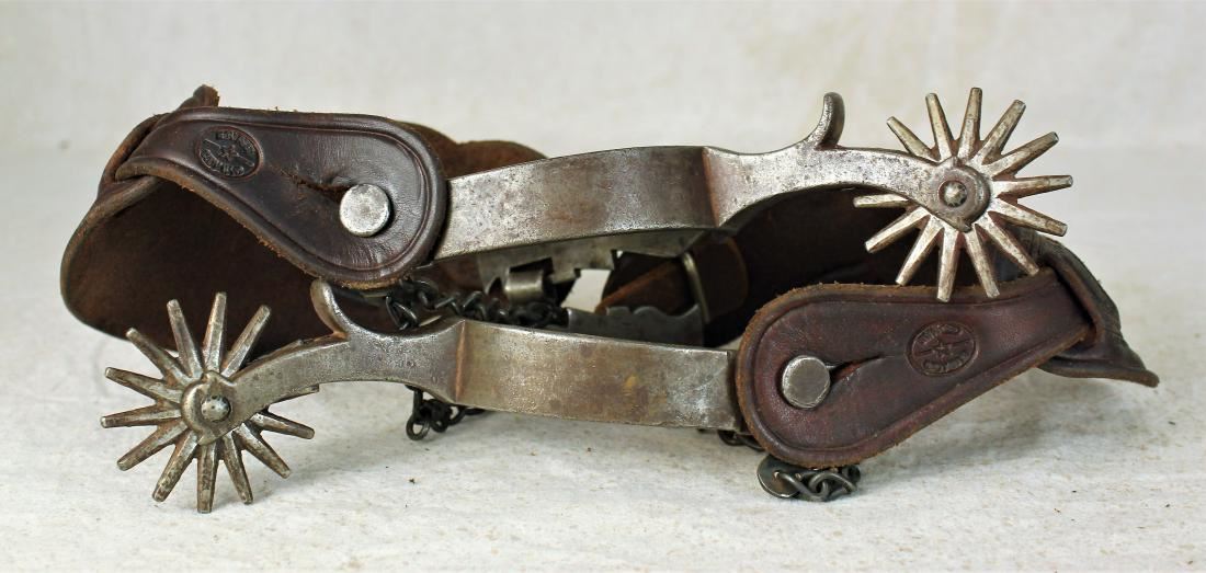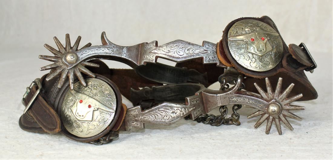 Very scarce single inlaid diamond pattern spurs with classic Gutierrez engraved silver and step down button plates. Accented by steerhead concho straps.