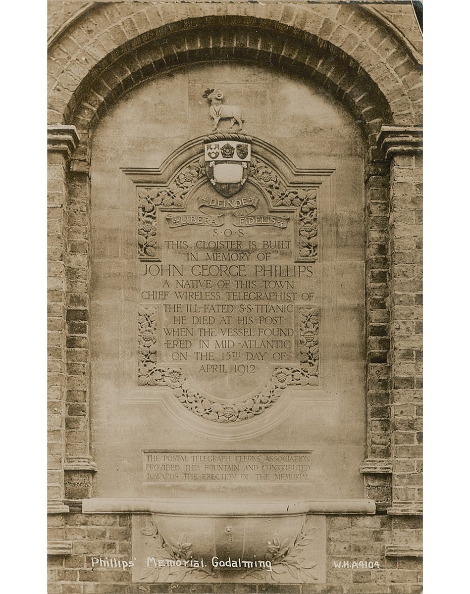 Unused real photo postcard close-up of the memorial cloister to telegraphist John Phillips, captioned at the bottom: "Phillips’ Memorial, Godalming.” In fine condition, with light silvering to dark areas of the image.