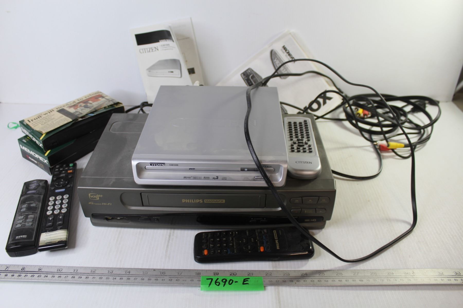 Phillips VHS Player (not working) - Citizen DVD Player (working) - (4) Remotes - (3) VHS Tapes