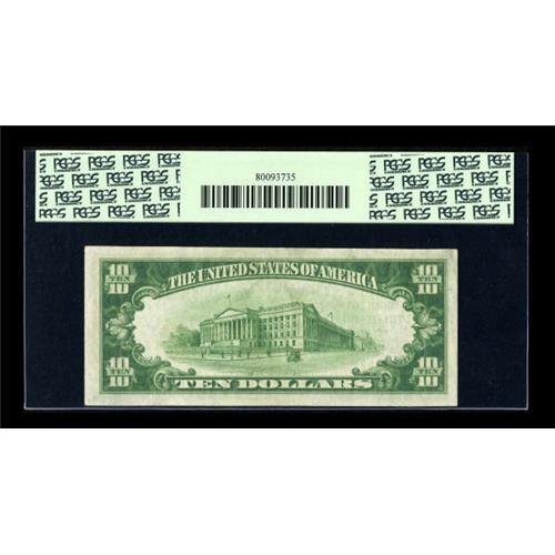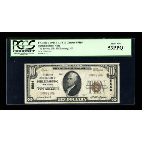 <B>Phillipsburg, NJ</B></I> - $10 1929 Ty. 1 <B>The Second NB</B></I> Ch. # 5556<BR> Just a couple of dozen small size are reported on this Warren County institution and this Type 1 $10 may well be the finest known. Certified by PCGS as <B>About New 53PPQ</B></I>, just the slightest handling can be seen through the third party holder.<BR><BR><b>Shipping:</b> Coins & Currency (<a target="_blank" href="http://www.heritageauctions.com/common/shipping.php">view shipping information</a>)