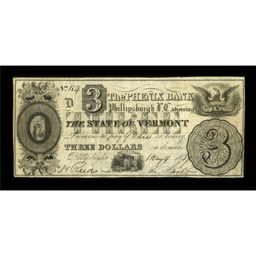 <B>Phillipsburgh, LC- The Phenix Bank</B></I> $3 May 4, 1837 Ch. # 590-10-02-06<BR> This bank is thought to have been a spurious institution of the type that proliferated during the "Hard Times" period 1837-1839. Although certainly a Canadian issue, the note's use of the Vermont nomenclature was likely done to make people believe that the was from a U.S. bank and to facilitate circulation in Vermont as well. Charlton comments that "All [notes from here] are very rare." Charlton also indicates signed and issued threes as "Institutional collections only," but this is a signed and issued $3 which is available right now to the collecting fraternity. Nice <B>Fine-Very Fine.</B></I><BR><I>From The Thomas M. Flynn Collection</B></I><BR><BR><b>Shipping:</b> Coins & Currency (<a target="_blank" href="http://www.heritageauctions.com/common/shipping.php">view shipping information</a>)