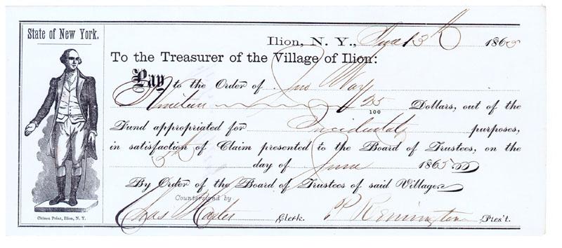 . PHILO REMINGTON (1816-1889) The son of the founder of the Remington gun company, Philo improved gun production and expanded into the manufacture of typewriters and other products. PPDS. 1 page. 8 1/8” x 3 ½” . Ilion, New York. June 13, 1865. An order to “Pay…nineteen dollars and 25 cents out of the fund appropriated for Incidental purposes in satisfaction of Claim present to the Board of Trustees, on the 5th day of June, 1865. By Order of the Board of Trustees of said Village”. A nice vignette of Washington at left. Boldly signed by Remington at lower right as president. Cut cancelled. Very Fine.