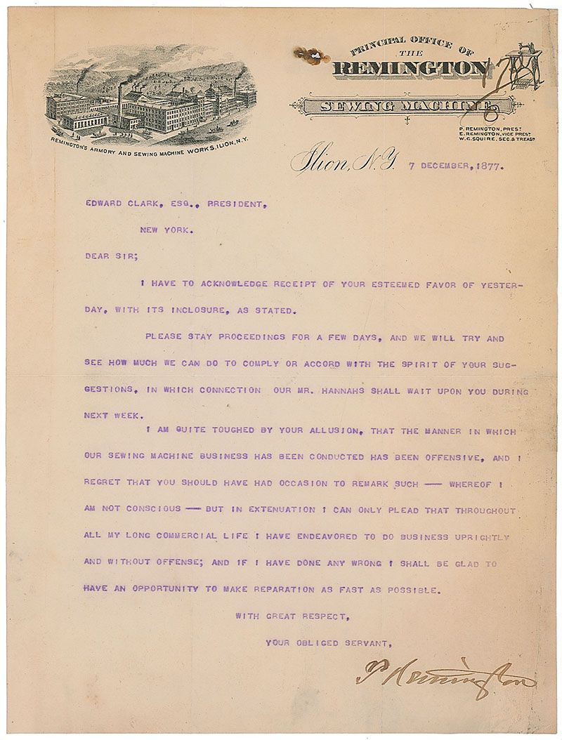 Industrialist (1816–1889) who succeeded his father, Eliphalet Remington, as head of the Remington firearms company, and went on to develop the first major US typewriter manufacturing business. TLS signed “P. Remington,” one page, 8.25 x 10.75, Remington Sewing Machine letterhead, December 7, 1877. Cordial response to an enraged customer threatening legal action. In part: “Please stay proceedings for a few days and we will try and see how much we can do to comply or accord with the spirit of your suggestions…I am quite touched by your allusion that the manner in which our sewing machine business has been conducted has been offensive…but in extenuation I can only plead that throughout all my long commercial life I have endeavored to do business uprightly and without offense; and if I have done any wrong I shall be glad to have an opportunity to make reparation as fast as possible.” A repaired tear affecting the extreme end of the signature and a small stained hole at the top, otherwise fine condition. An especially interesting letter, as it was written using the first model of Remington’s typewriter in which the type was all in uppercase letters.