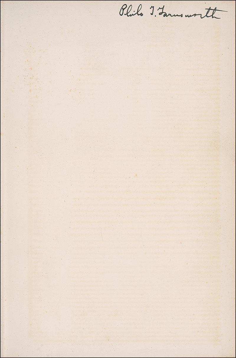 Inventor (1906 - 1971) best known for inventing the first fully electronic television system. Signed book from his personal library: Physical Optics. Later printing. NY: Macmillan Company. Hardcover, 5.75 x 8.25, 846 pages. Signed at the top of the first free end page, “Philo T. Farnsworth.” Some scattered light foxing to inside pages, light toning to signed page, and scattered light wear to covers, otherwise fine condition. RRAuction COA.