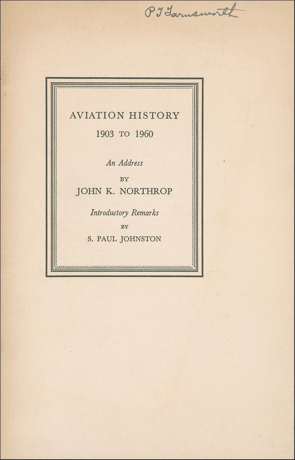 Inventor (1906-1971) best known for inventing the first fully electronic television system. A booklet from his personal library, entitled ‘Aviation History 1903 to 1960, An Address by John K. Northrop,’ 6 x 9, 31 pages. Signed on the cover in black ink by Farnsworth. In fine condition, with some light toning to cover. Accompanied by an FDC bearing a cachet honoring Farnsworth, signed by his wife Elma.
