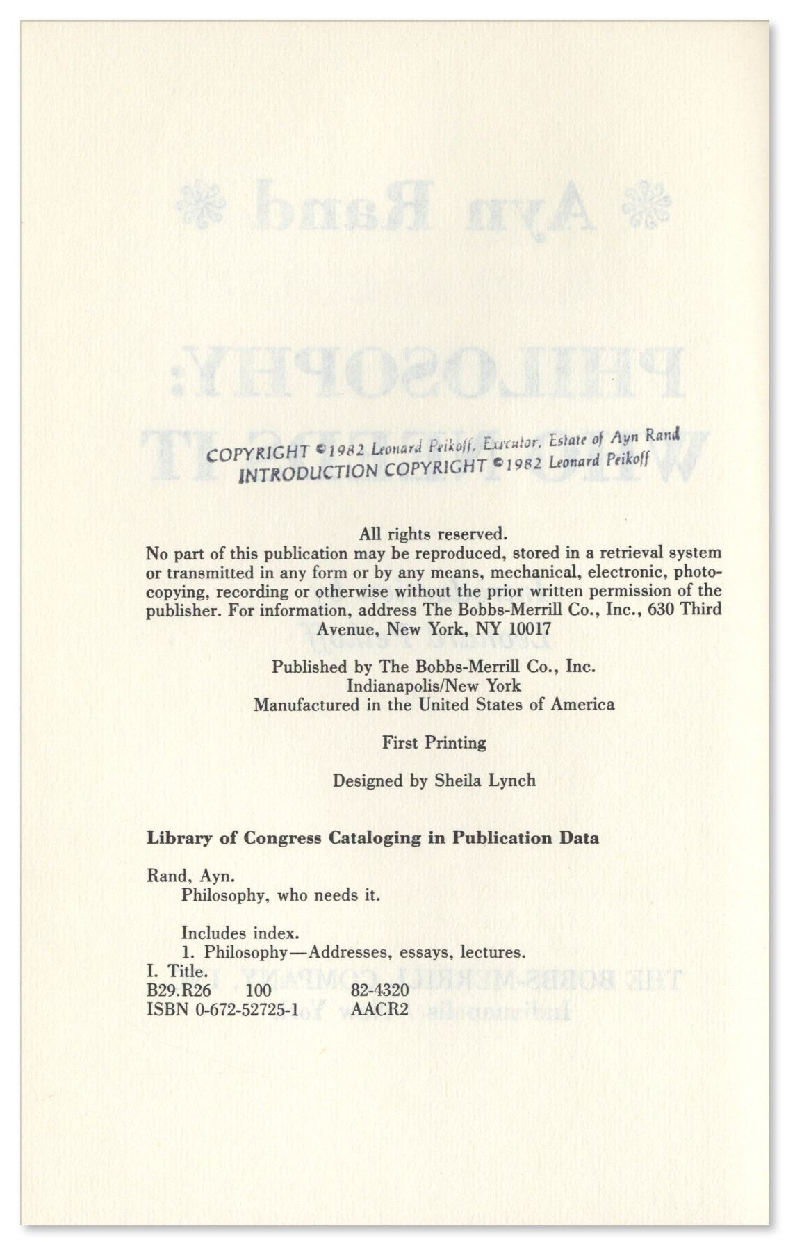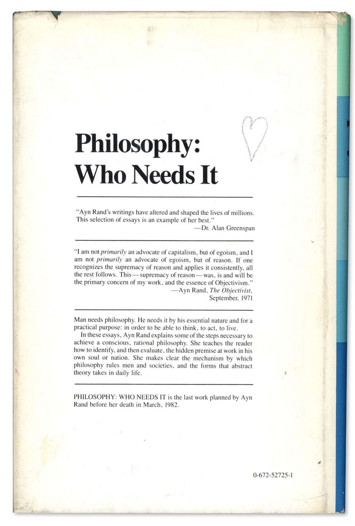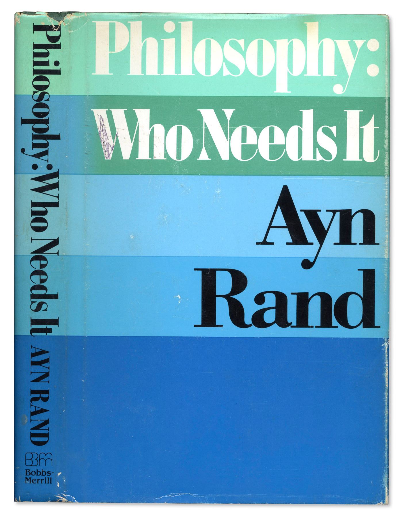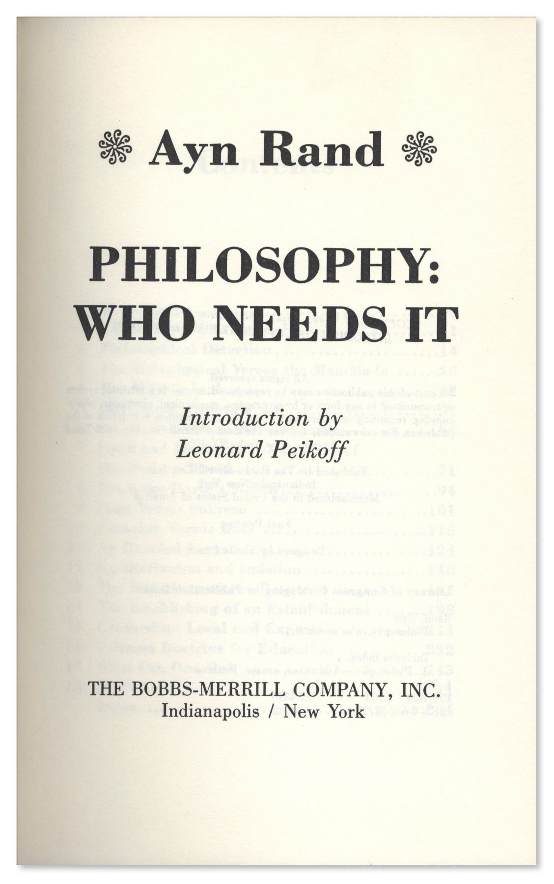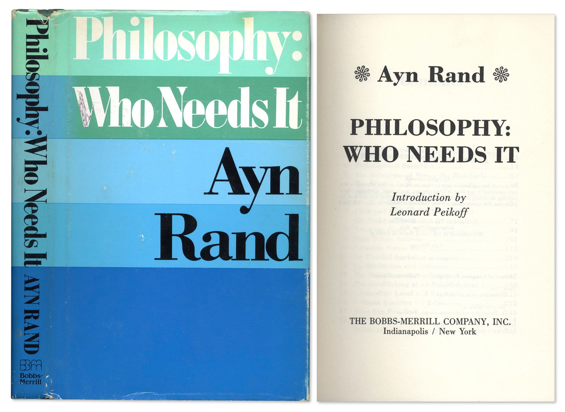 First edition, first printing of ''Philosophy: Who Needs It?'' by Ayn Rand. New York: The Bobbs-Merrill Company: 1982. With an introduction by Leonard Peikoff, founder of the Ayn Rand Institute. First edition, first printing, with original dust jacket. Light shelf wear to dust jacket, in very good condition. Book is near fine except for an inked heart symbol to the rear free endpaper.