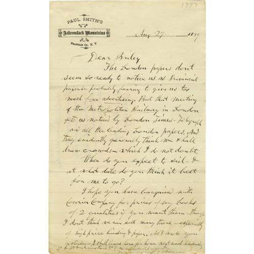 <B>Phineas T. Barnum Autograph Letter Signed to His Partner James Bailey</B></I> A.L.S. <I>"P.T. Barnum",</B></I> 1 p., 6" x 9.5", Franklin County, NY , Aug. 27, 1889, docketted by Bailey on the verso in pencil. Barnum writes: <I>"The London papers don't seem so ready to notice us as Provincial papers, probably fearing to give us too much free advertising. But that meeting of the Metropolitan Railway in London gets us noticed by London Times. Telegraph and all leading London papers, and they evidently generally think we shall draw crowds, which I do not doubt. When do you expect to sail, & what date do you think it best for me to go? I hope you have bargained with Courier Company for prices of my books of 2 qualities if you want them though. I don't think we can sell many there - especially of high price binding & paper. As I wrote you yesterday - I shall leave here for home next week Wednesday 4th Sept & arriving there 5th if no accident prevents. Truly Yours P T Barnum".</B></I> James Bailey, Barnum's former competitor and now business partner, adds his holograph on the verso docketting: <I>"Notify Barnum when sail/ Show sails Oct. 18 / 2 kind Barnums Life / Can't show Phila too late / bills boxed for London / agents gone."</B></I> Barnum and Bailey, who had originally partnered in 1881 and split ways in 1885, had reunited in 1888 to form "Barnum & Bailey Greatest Show On Earth", which toured around the world. This letter is no doubt making plans for the London leg of that tour. <BR><BR>Accompanied by a double-sided yellow flyer, likely circa 1881, announcing "P.T. Barnum's Greatest show on Earth, and the Great London Circus, Sanger's Royal British Menagerie" in New York. This would be the premier of the use and presentation of a three-ring circus. <BR><BR>The letter has a light waterstain at bottom margin, ink remains clear, legible, and ideal for display. Flyer has archival tape at top, with a few tiny tears at margins. Engravings are quite clean and very attractive. Overall condition of both items is very good.<BR><BR><b>Shipping:</b> Flat Material, Small (<a target="_blank" href="http://www.heritageauctions.com/common/shipping.php">view shipping information</a>)