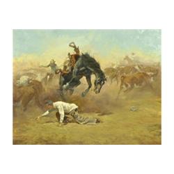 Phippen’s painting <i>A Tie Hard in a Storm</i> is a prime example of the artist’s work in the classic action-oriented Western vein pioneered by Charles M. Russell and Frederic Remington. As a founding member of the Cowboy Artists of America, Phippen helped to create and popularize the cowboy art aesthetic that continues to enjoy great popularity to this day. Rather than romanticized historical subjects, Phippen preferred painting contemporary cowboy life, sometimes focusing on quiet day-to-day activities and other times on dramatic moments of excitement and danger. - DC
