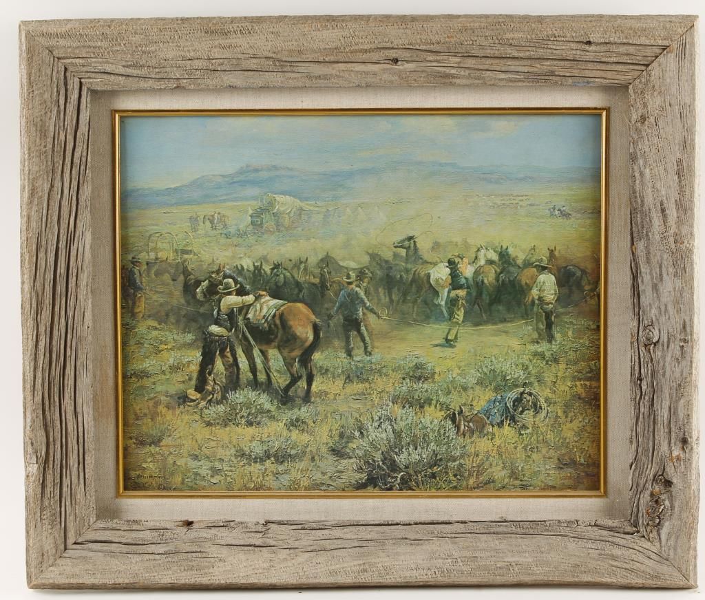 Fine Art Print on canvas by Geo Phippen depicting horse herding. 19" x 18". In faux bar wood frame.