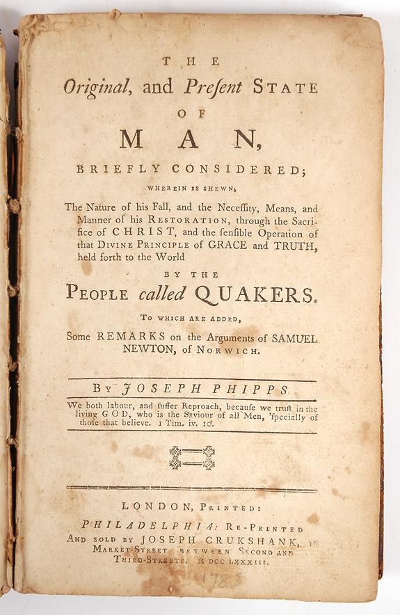 Phipps, Joseph. Original, and Present State of Man, Briefly Considered by the…Quakers. Published by Joseph Crukshank, Philadelphia, 8vo, 209 pages. Originally published in London, this is the first American edition (not listed in "Smith"), Evans #18739. Original leather boards are heavily worn and most of spine is missing; front cover is loose but attached. Light to heavy toning.