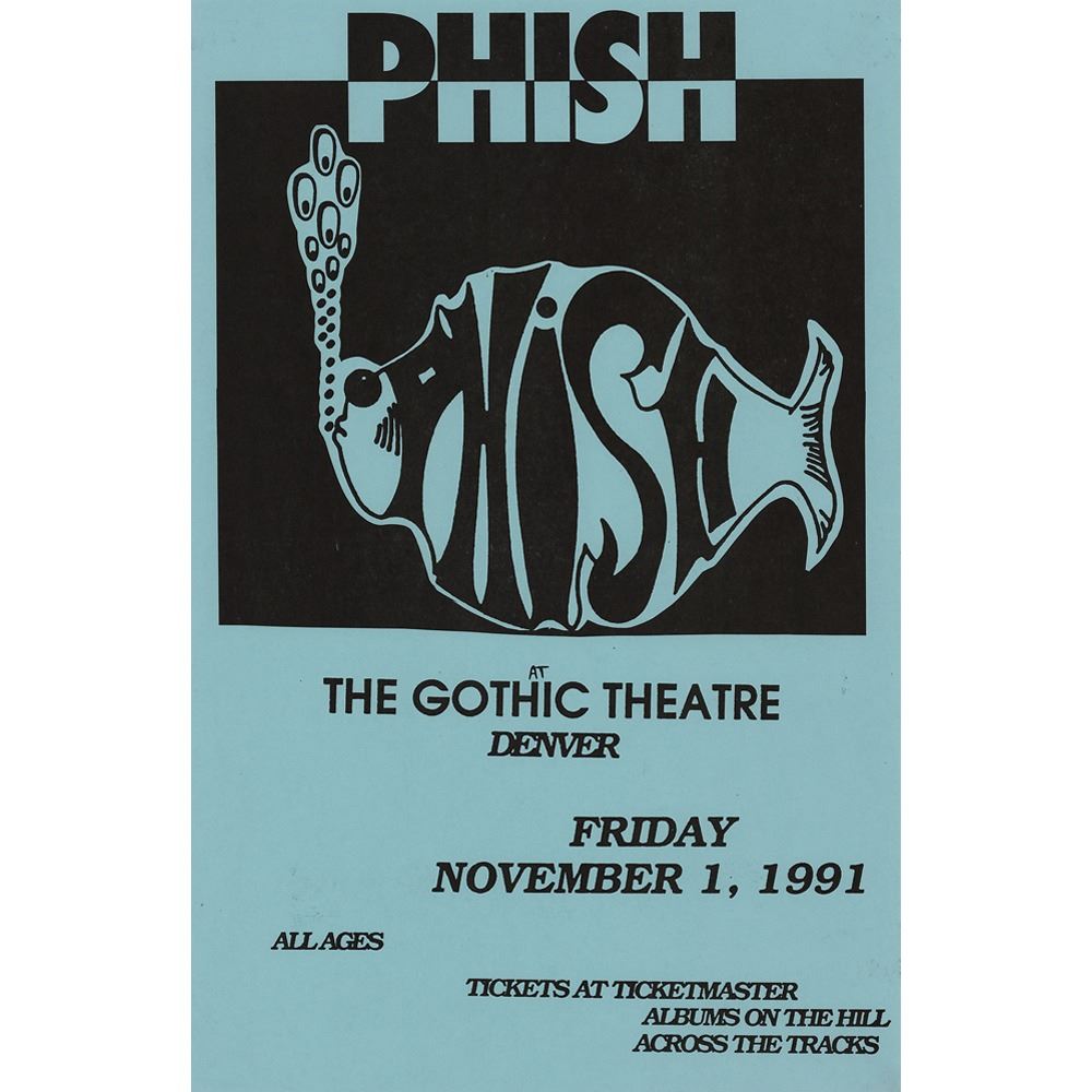 Original blue-and-black 11 x 17 concert poster for Phish at The Gothic Theatre in Denver, Colorado, on November 1, 1991, featuring the band's classic logo. In fine condition.