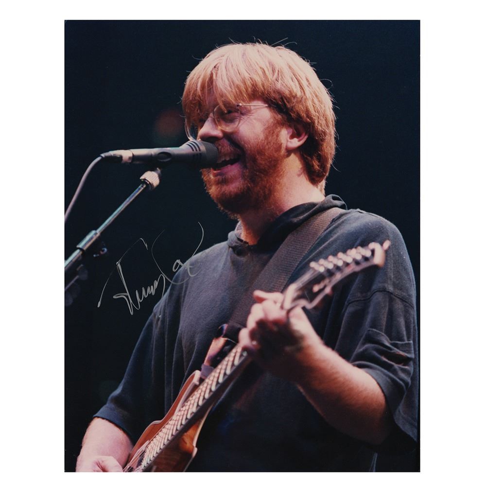 Color satin-finish 11 x 14 photo of Phish's frontman playing guitar during a concert, signed in silver ink by Trey Anastasio. In fine condition. Accompanied by an unused backstage 'local crew' pass for a Phish concert at the XL Center in Hartford, Connecticut, on October 27, 2013.