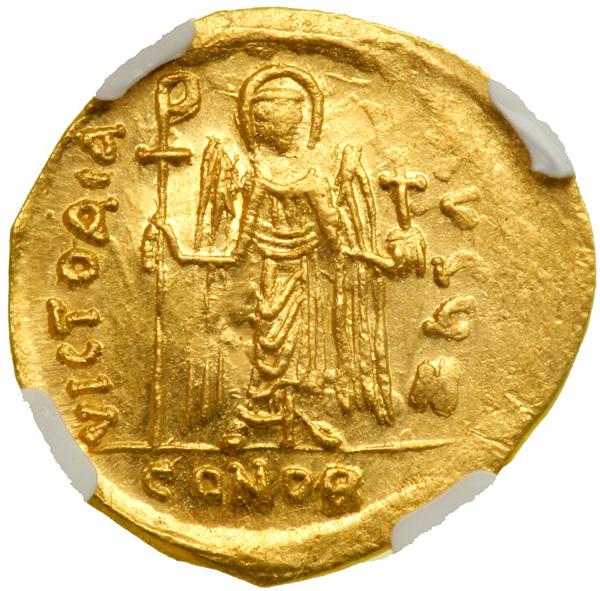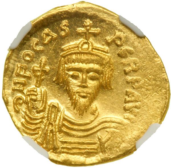 Phocas, 602-610. Gold Solidus (4.32 g) minted at Constantinople. Facing, crowned bust of Phocas holding globus cruciger. Reverse: Angel standing, facing, with globus cruciger and long staff. D.O. 10; S. 620. Usual weakly struck areas, lustrous. NGC graded MS: Strike 4/5; Surface 3/5; clipped.