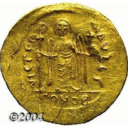 <B>Phocas.</B></I> A.D. 602-610. AV solidus (21 mm, 4.49 g). Constantinople, A.D. 603-607. Crowned facing bust, holding cross / Angel standing facing, holding long P-headed cross and globus cruciger; (Gamma)/CONOB. DOC 5c; SB 618. XF, choice obverse. <BR><I>From the Geneva Collection.</B></I> <BR><BR><B>Important notice:</B> Heritage usually auctions material at the rate of 200-250 lots per hour. On some occasions eBay Live bid software or the Internet may not be able to keep up with the pace of the auction. We recommend placing a realistic absentee bid now as insurance to avoid disappointment. Occasionally the auctioneer may eliminate or reject an eBay Live bid, and the auctioneer may also reopen a lot after the close of the eBay live bidding (usually because we missed an audience bid), and may reject your bid even if it shows you as the winning bidder. By bidding via eBay Live, you agree that Heritage may award the lot to another bidder at its sole discretion under the circumstances described above or any other reasonable circumstances. Since eBay bids are not shown to us until we open the lot on the floor, we treat those bids just like floor bids. In most cases the floor responds before the eBay bid is presented to us, due to Internet lag time, so for consistency we have made it a policy that floor bids are always considered first over tie eBay live bids. Also please note that all Heritage lots purchased through eBay Live carry a 20% Buyer's Premium. Please make sure you read the Terms and Conditions before you bid.