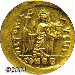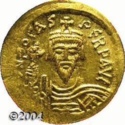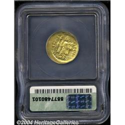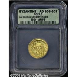 <B>Phocas.</B></I> A.D. 602-610. AV solidus (21 mm). Constantinople, A.D. 603-607. Crowned facing bust, holding cross / Angel standing facing, holding long P-headed cross and globus cruciger; I/CONOB. DOC 5j; SB 618. AU 55 ICG. <BR><BR><B>Important notice:</B> Heritage usually auctions material at the rate of 200-250 lots per hour. On some occasions eBay Live bid software or the Internet may not be able to keep up with the pace of the auction. We recommend placing a realistic absentee bid now as insurance to avoid disappointment. Occasionally the auctioneer may eliminate or reject an eBay Live bid, and the auctioneer may also reopen a lot after the close of the eBay live bidding (usually because we missed an audience bid), and may reject your bid even if it shows you as the winning bidder. By bidding via eBay Live, you agree that Heritage may award the lot to another bidder at its sole discretion under the circumstances described above or any other reasonable circumstances. Since eBay bids are not shown to us until we open the lot on the floor, we treat those bids just like floor bids. In most cases the floor responds before the eBay bid is presented to us, due to Internet lag time, so for consistency we have made it a policy that floor bids are always considered first over tie eBay live bids. Also please note that all Heritage lots purchased through eBay Live carry a 20% Buyer's Premium. Please make sure you read the Terms and Conditions before you bid.