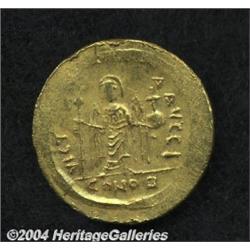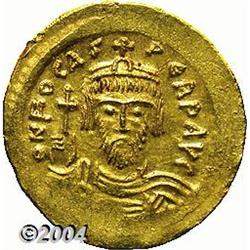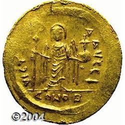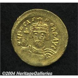 <B>Phocas.</B></I> A.D. 602-610. AV solidus (21 mm, 4.46 g). Constantinople, A.D. 603-607. Crowned facing bust, holding cross / Angel standing facing, holding long P-headed cross and globus cruciger; I/CONOB. DOC 5j; SB 618. Good XF. <BR><I>From the Geneva Collection.</B></I> <BR><BR><B>Important notice:</B> Heritage usually auctions material at the rate of 200-250 lots per hour. On some occasions eBay Live bid software or the Internet may not be able to keep up with the pace of the auction. We recommend placing a realistic absentee bid now as insurance to avoid disappointment. Occasionally the auctioneer may eliminate or reject an eBay Live bid, and the auctioneer may also reopen a lot after the close of the eBay live bidding (usually because we missed an audience bid), and may reject your bid even if it shows you as the winning bidder. By bidding via eBay Live, you agree that Heritage may award the lot to another bidder at its sole discretion under the circumstances described above or any other reasonable circumstances. Since eBay bids are not shown to us until we open the lot on the floor, we treat those bids just like floor bids. In most cases the floor responds before the eBay bid is presented to us, due to Internet lag time, so for consistency we have made it a policy that floor bids are always considered first over tie eBay live bids. Also please note that all Heritage lots purchased through eBay Live carry a 20% Buyer's Premium. Please make sure you read the Terms and Conditions before you bid.