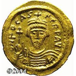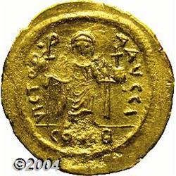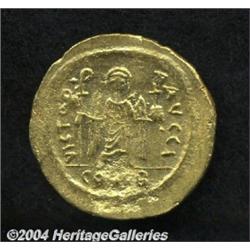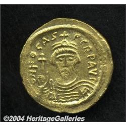 <B>Phocas.</B></I> A.D. 602-610. AV solidus (21 mm, 4.51 g). Constantinople, A.D. 603-607. Crowned facing bust, holding cross / Angel standing facing, holding long P-headed cross and globus cruciger; I/CONOB. DOC 5j; SB 618. XF, die rust. <BR><I>From the Geneva Collection.</B></I> <BR><BR><B>Important notice:</B> Heritage usually auctions material at the rate of 200-250 lots per hour. On some occasions eBay Live bid software or the Internet may not be able to keep up with the pace of the auction. We recommend placing a realistic absentee bid now as insurance to avoid disappointment. Occasionally the auctioneer may eliminate or reject an eBay Live bid, and the auctioneer may also reopen a lot after the close of the eBay live bidding (usually because we missed an audience bid), and may reject your bid even if it shows you as the winning bidder. By bidding via eBay Live, you agree that Heritage may award the lot to another bidder at its sole discretion under the circumstances described above or any other reasonable circumstances. Since eBay bids are not shown to us until we open the lot on the floor, we treat those bids just like floor bids. In most cases the floor responds before the eBay bid is presented to us, due to Internet lag time, so for consistency we have made it a policy that floor bids are always considered first over tie eBay live bids. Also please note that all Heritage lots purchased through eBay Live carry a 20% Buyer's Premium. Please make sure you read the Terms and Conditions before you bid.