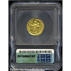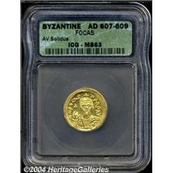 <B>Phocas.</B></I> A.D. 602-610. AV solidus (20 mm). Constantinople, A.D. 607-610. Crowned facing bust, holding cross / Angel standing facing, holding long P-headed cross and globus cruciger; E/CONOB. DOC 10e; SB 620. MS63 ICG. <BR><BR><B>Important notice:</B> Heritage usually auctions material at the rate of 200-250 lots per hour. On some occasions eBay Live bid software or the Internet may not be able to keep up with the pace of the auction. We recommend placing a realistic absentee bid now as insurance to avoid disappointment. Occasionally the auctioneer may eliminate or reject an eBay Live bid, and the auctioneer may also reopen a lot after the close of the eBay live bidding (usually because we missed an audience bid), and may reject your bid even if it shows you as the winning bidder. By bidding via eBay Live, you agree that Heritage may award the lot to another bidder at its sole discretion under the circumstances described above or any other reasonable circumstances. Since eBay bids are not shown to us until we open the lot on the floor, we treat those bids just like floor bids. In most cases the floor responds before the eBay bid is presented to us, due to Internet lag time, so for consistency we have made it a policy that floor bids are always considered first over tie eBay live bids. Also please note that all Heritage lots purchased through eBay Live carry a 20% Buyer's Premium. Please make sure you read the Terms and Conditions before you bid.