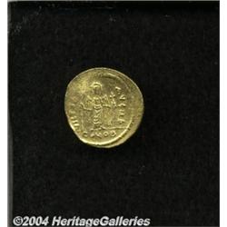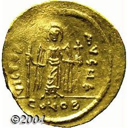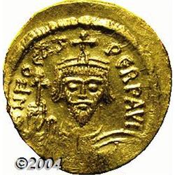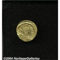 <B>Phocas.</B></I> A.D. 602-610. AV solidus (21 mm, 4.51 g). Constantinople, A.D. 607-610. Crowned facing bust, holding cross / Angel standing facing, holding long P-headed cross and globus cruciger; E/CONOB. DOC 10e; SB 620. XF. <BR><I>From the Geneva Collection.</B></I> <BR><BR><B>Important notice:</B> Heritage usually auctions material at the rate of 200-250 lots per hour. On some occasions eBay Live bid software or the Internet may not be able to keep up with the pace of the auction. We recommend placing a realistic absentee bid now as insurance to avoid disappointment. Occasionally the auctioneer may eliminate or reject an eBay Live bid, and the auctioneer may also reopen a lot after the close of the eBay live bidding (usually because we missed an audience bid), and may reject your bid even if it shows you as the winning bidder. By bidding via eBay Live, you agree that Heritage may award the lot to another bidder at its sole discretion under the circumstances described above or any other reasonable circumstances. Since eBay bids are not shown to us until we open the lot on the floor, we treat those bids just like floor bids. In most cases the floor responds before the eBay bid is presented to us, due to Internet lag time, so for consistency we have made it a policy that floor bids are always considered first over tie eBay live bids. Also please note that all Heritage lots purchased through eBay Live carry a 20% Buyer's Premium. Please make sure you read the Terms and Conditions before you bid.