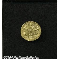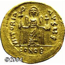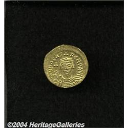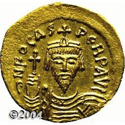 <B>Phocas.</B></I> A.D. 602-610. AV solidus (21 mm, 4.29 g). Constantinople, A.D. 607-610. Crowned facing bust, holding cross / Angel standing facing, holding long P-headed cross and globus cruciger; S/CONOB. DOC 10f; SB 620. Choice XF, clipped. <BR><I>From the Geneva Collection.</B></I> <BR><BR><B>Important notice:</B> Heritage usually auctions material at the rate of 200-250 lots per hour. On some occasions eBay Live bid software or the Internet may not be able to keep up with the pace of the auction. We recommend placing a realistic absentee bid now as insurance to avoid disappointment. Occasionally the auctioneer may eliminate or reject an eBay Live bid, and the auctioneer may also reopen a lot after the close of the eBay live bidding (usually because we missed an audience bid), and may reject your bid even if it shows you as the winning bidder. By bidding via eBay Live, you agree that Heritage may award the lot to another bidder at its sole discretion under the circumstances described above or any other reasonable circumstances. Since eBay bids are not shown to us until we open the lot on the floor, we treat those bids just like floor bids. In most cases the floor responds before the eBay bid is presented to us, due to Internet lag time, so for consistency we have made it a policy that floor bids are always considered first over tie eBay live bids. Also please note that all Heritage lots purchased through eBay Live carry a 20% Buyer's Premium. Please make sure you read the Terms and Conditions before you bid.