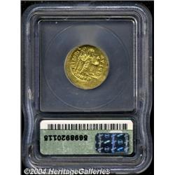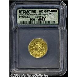 <B>Phocas.</B></I> A.D. 602-610. AV solidus (mm, g). Constantinople, A.D. 607-610. Crowned facing bust, holding cross / Angel standing facing, holding long P-headed cross and globus cruciger; (Theta)/CONOB. DOC 10i; SB 620. MS62 ICG. <BR><BR><B>Important notice:</B> Heritage usually auctions material at the rate of 200-250 lots per hour. On some occasions eBay Live bid software or the Internet may not be able to keep up with the pace of the auction. We recommend placing a realistic absentee bid now as insurance to avoid disappointment. Occasionally the auctioneer may eliminate or reject an eBay Live bid, and the auctioneer may also reopen a lot after the close of the eBay live bidding (usually because we missed an audience bid), and may reject your bid even if it shows you as the winning bidder. By bidding via eBay Live, you agree that Heritage may award the lot to another bidder at its sole discretion under the circumstances described above or any other reasonable circumstances. Since eBay bids are not shown to us until we open the lot on the floor, we treat those bids just like floor bids. In most cases the floor responds before the eBay bid is presented to us, due to Internet lag time, so for consistency we have made it a policy that floor bids are always considered first over tie eBay live bids. Also please note that all Heritage lots purchased through eBay Live carry a 20% Buyer's Premium. Please make sure you read the Terms and Conditions before you bid.