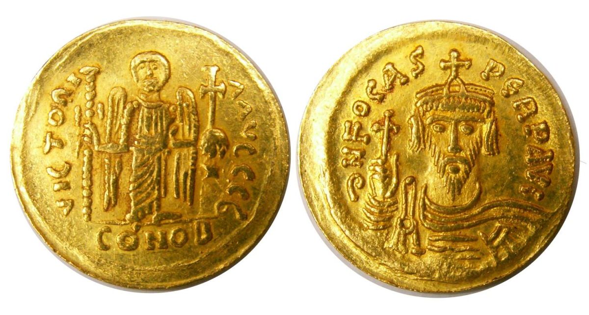 Phocus Solidus. 602-610 AD. Constantinopolis. Obv: FOCAS PERP. AVG. Rev.: VICTORIA AVG4I. CONOB, on exergue. Gold.