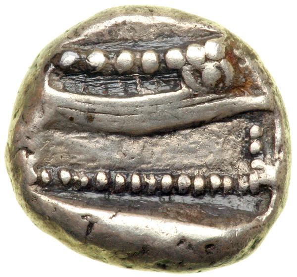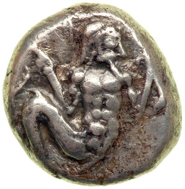 Phoenicia, Arados, c. 490-470 BC. AR Tetrobol (3.15 g). Merman right holding dolphin in each hand. Reverse: Galley right with row of shields along bulwarks. SNG Cop 1; BMC 3. Very attractive and high grade for this issue; Choice Very Fine.