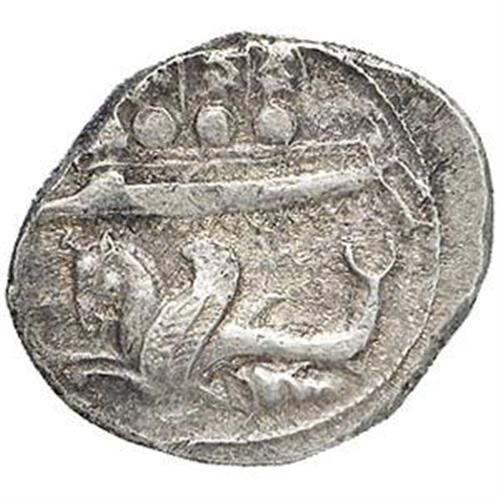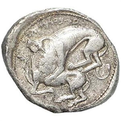 Mondo Greco. Asia Greca. Phoenicia, Byblos. Re Ainel. Doppio shekel, circa 333 a.C. D/ Galera a sinistra, con tre opliti con scudi rotondi. Sotto, ippocampo e conchiglia di murice. R/ Toro inginocchiato a sinistra. Sul suo dorso, un leone che lo attacca. Sopra, legenda fenicia (= Ainel, re di Gebal). Babelon (Biblioth®que Nationale Catalogue, ii) pl. XXVI, 23. gr. 13.36 RR. AG. Bel BB.