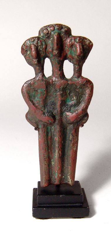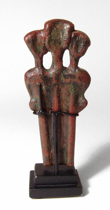 A Phoenician-Canaanite three-headed bronze idol, c. 1200 - 1000 BC, of flat profile and low relief, with three legs, wide torso and two arms, the central head a bit larger than the two beside it. H: 3 ½ in (8.9 cm). Nice brown patina, custom stand. Ex Archaeology Center, Tel-Aviv.