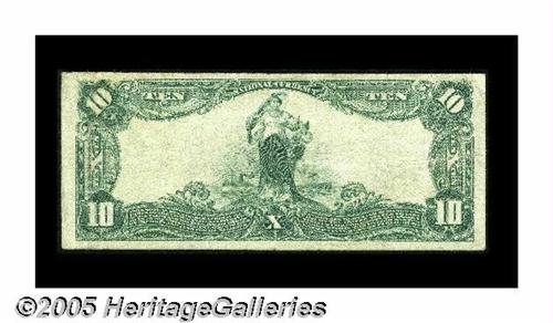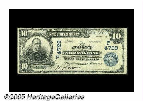 <B>Phoenix, AZ</B></I> - $10 1902 Plain Back Fr. 628 <B>The Phoenix NB</B></I> Ch. # (P)4729<BR>While never easily available, large notes of any kind from this state have simply disappeared from the marketplace during the past few years. This piece, while lacking the President's signature and bearing a redrawn Cashier's signature, is still nice enough to attract considerable interest from the many collectors who desire to own even one large specimen from this rare state. <B>Fine.</B></I>