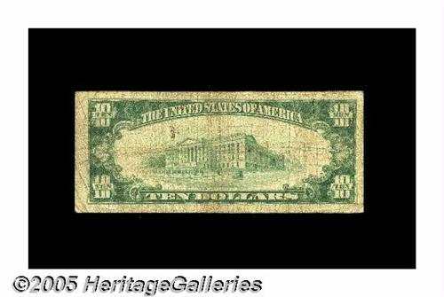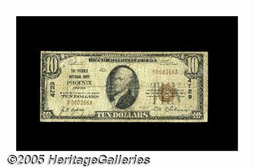 <B>Phoenix, AZ</B></I> - $10 1929 Ty. 1 <B>The Phoenix NB</B></I> Ch. # 4729<BR>This institution was chartered in 1892 and its issue includes both territorial and state emissions. Although quite well circulated, this <B>Very Good</B></I> example is fairly presentable for the grade and displays only a few spindle and pin holes to distract. Likely to sell for about...