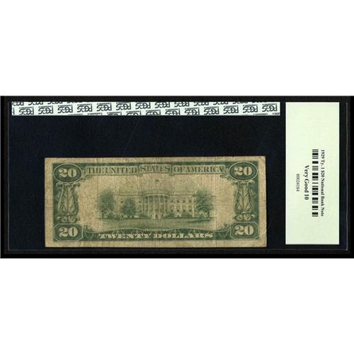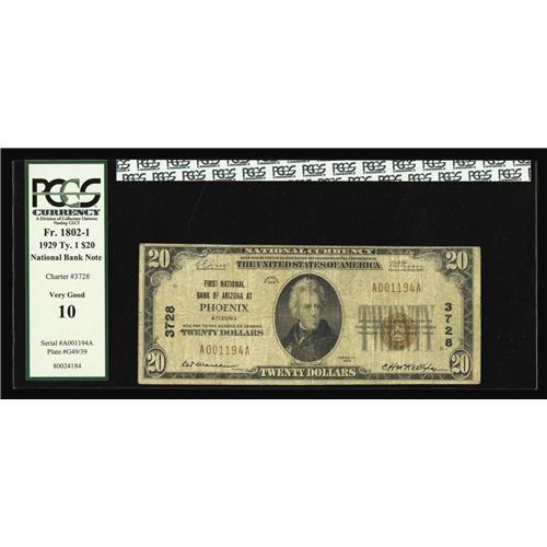 <B>Phoenix, AZ</B></I> - $20 1929 Ty. 1 <B>First NB of Arizona</B></I> Ch. # 3728<BR>A well circulated <B>PCGS Very Good 10</B></I> small size example from a state that is becoming very difficult to locate in any grade.