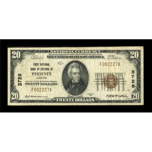 <B>Phoenix, AZ</B></I> - $20 1929 Ty. 1 <B>First NB of Arizona</B></I> Ch. # 3728<BR> Extremely broad margins for the issue are noted on this attractive mid-grade $20. The paper is wholly original. <B>Fine.</B></I><BR><I>From The Kansas City Collection.</B></I><BR><BR><b>Shipping:</b> Coins & Currency (<a target="_blank" href="http://www.heritageauctions.com/common/shipping.php">view shipping information</a>)