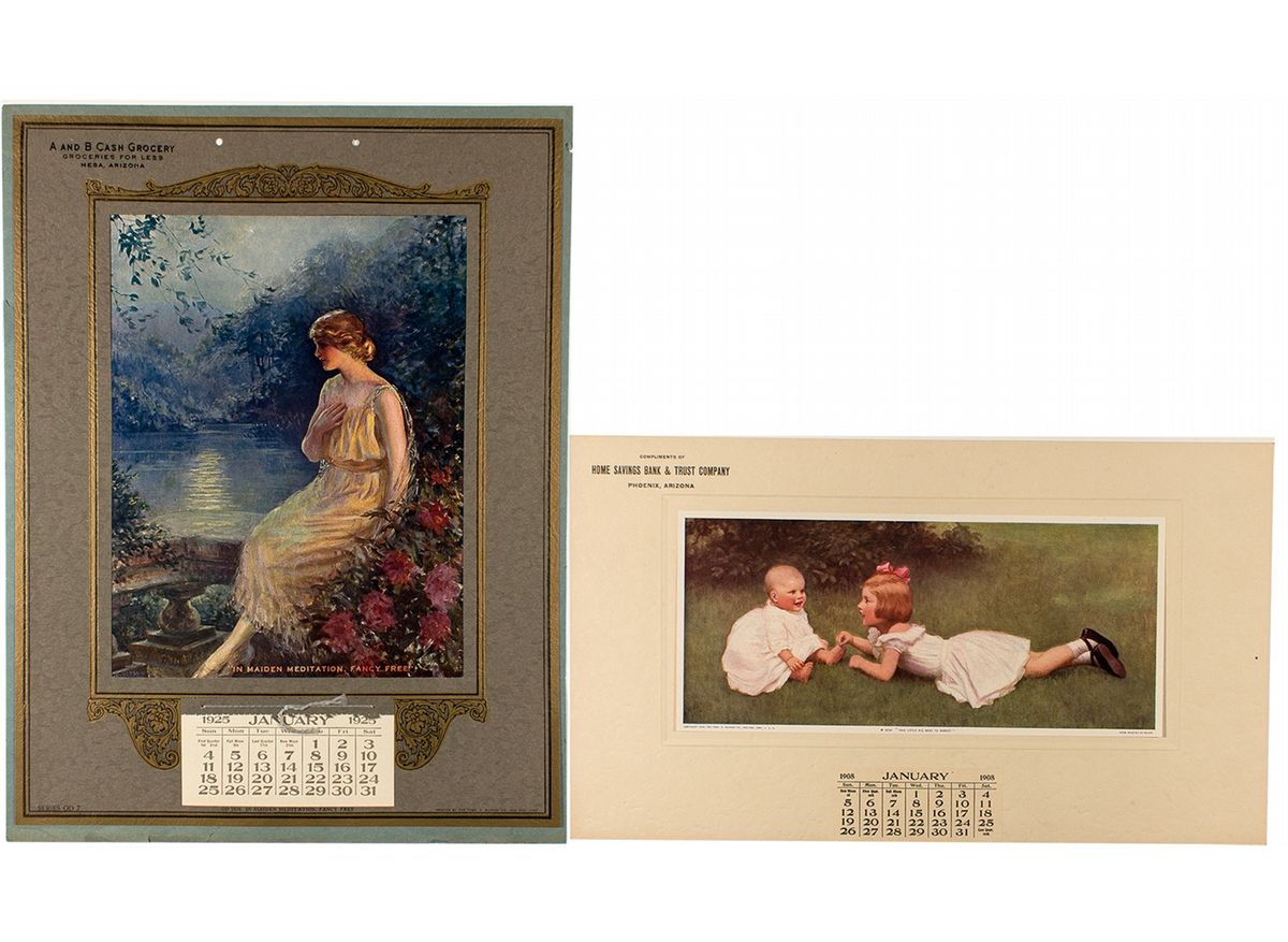 1908 Lot of 2. 1) A & B Cash Grocery. Groceries for Less. Mesa, Arizona. Calendar for January 1925. It measures 17" x 13" and has some wear. 2) Home Savings Bank & Trust Co. Phoenix, Arizona calendar for January 1908. It measures 16" x 9.30" and has little wear. Bud Bassett Collection - HKA#65578