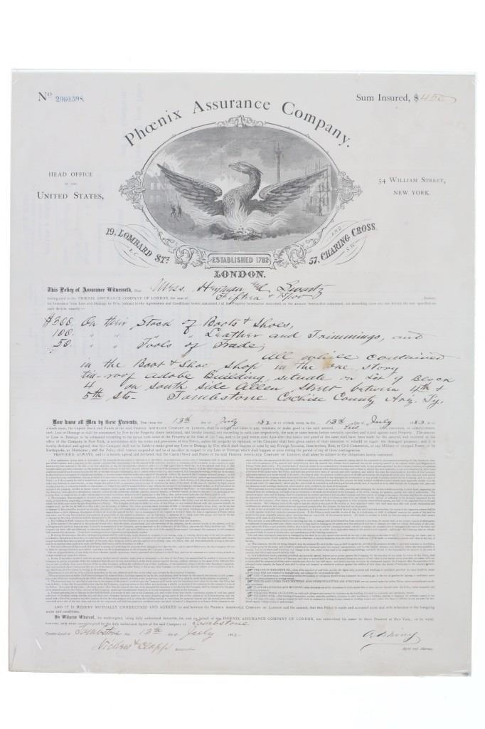 For your consideration is this original and issued insurance policy from the Phoenix Assurance Company for a boot and shoe shop in Tombstone, Arizona Territory. The Phoenix Assurance Company was established and based in London in 1782. The company had offices in both London and New York. This policy is dated July 13th, 1885 and was issued to the owner of the boot and shoe shop to insure his stock of boots, shoes, leather and trimmings at his Tombstone, Arizona Territory business for a total of $450.00 dollars. This issued insurance certificate shows good condition overall with slight wear present from its age and use over the years, but no major signs of damage is noted. It sits behind a plastic covering, set on a poster board and shrink wrapped to preserve its condition. It measures 22" L x 17" W and weighs 2 pounds and 2 ounces. Provenance: From the Tombstone Western Heritage Museum in Tombstone, Arizona TTD284