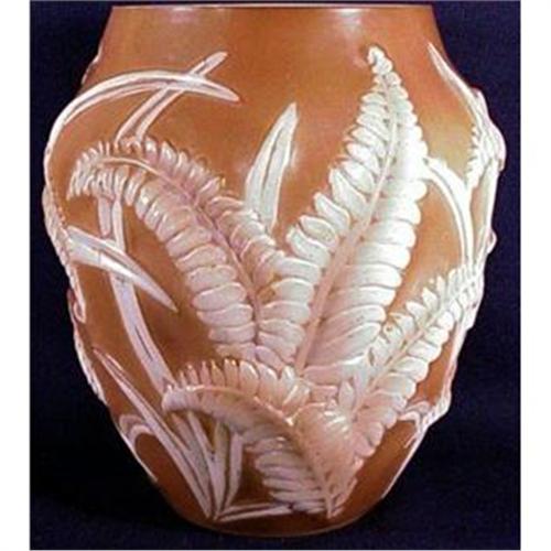 This 7" sculptured fern vase was made by the Phoenix/Consolidated glass company in 1938. It has a deep brown background and a brown overwipe on white design.