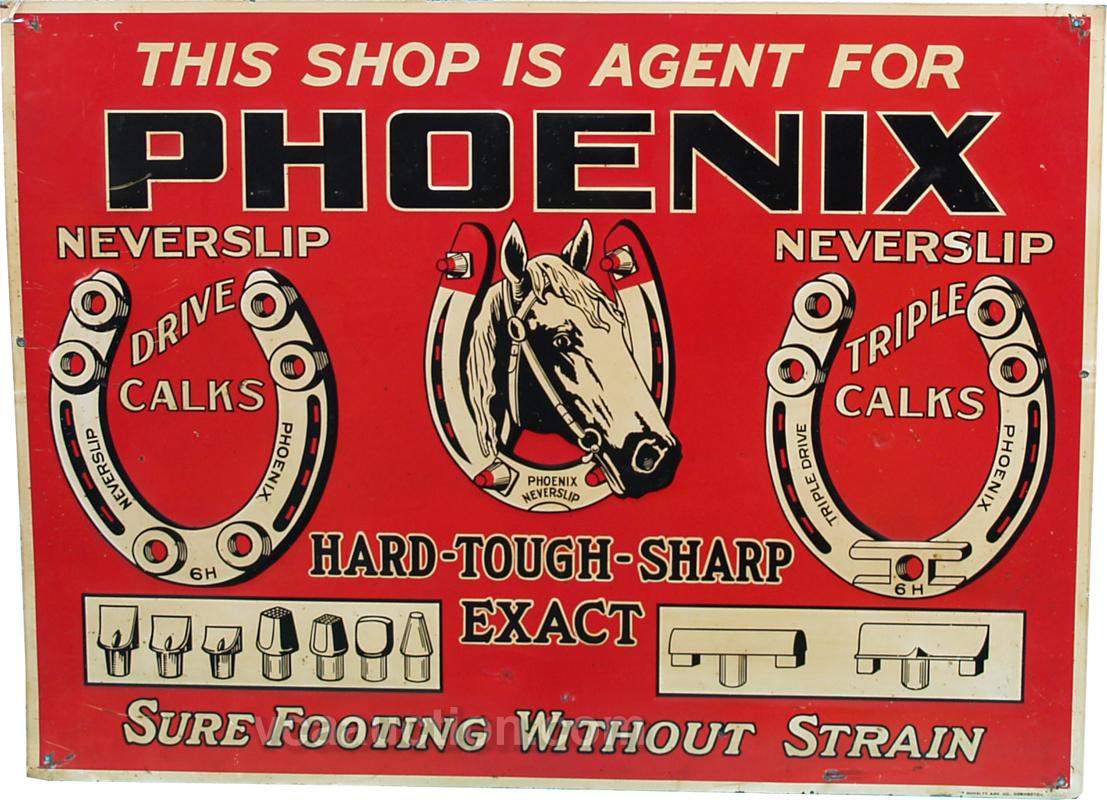 Phoenix Horseshoe Shop Advertisement Embossed Tin Sign, "This Shop Is Agent For Phoenix" c1930's - 24" x 18"