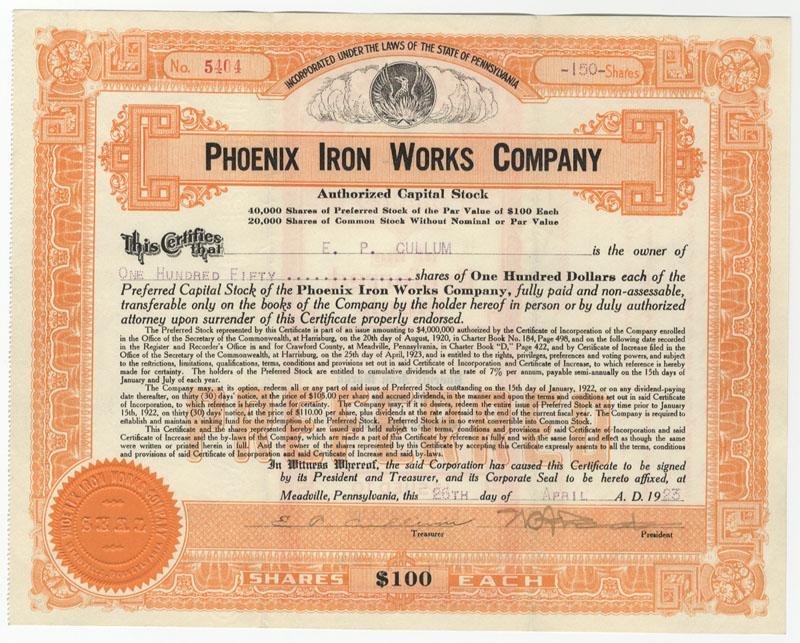 1923, Pennsylvania. Stock certificate for 105 shares. Orange/Black. Small vignette at top center of the Rising of the Phoenix. Uncancelled and very fine.