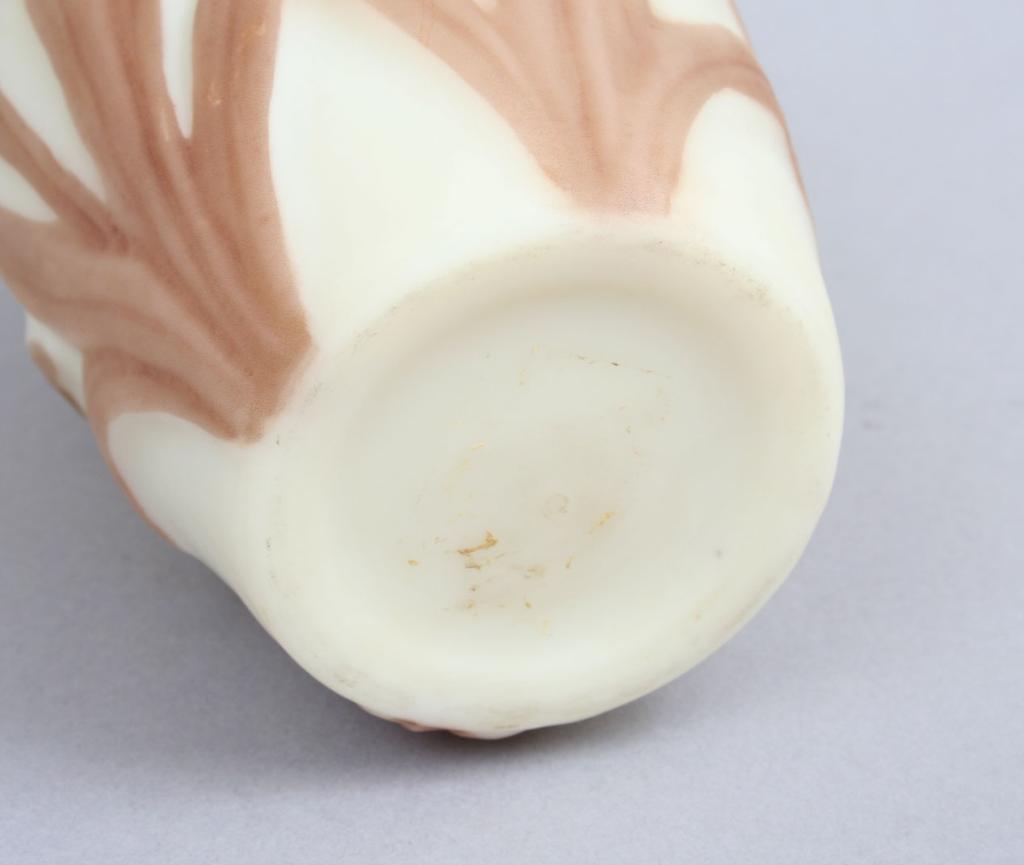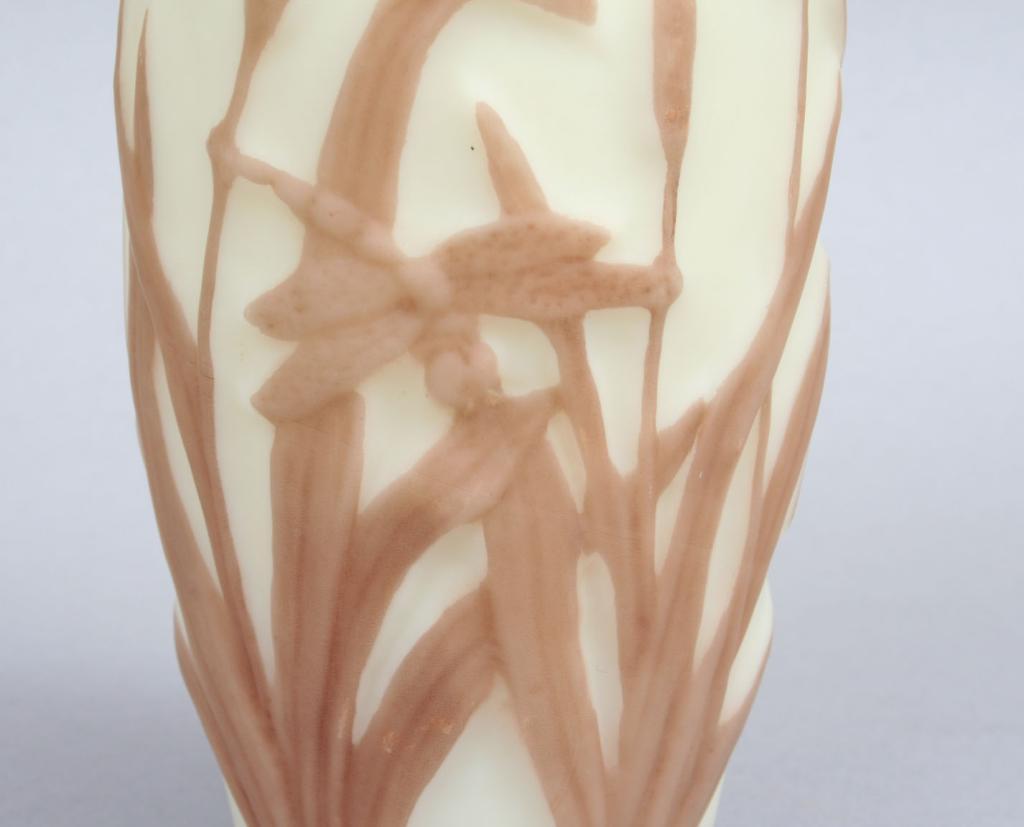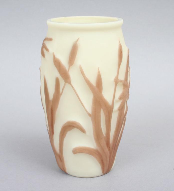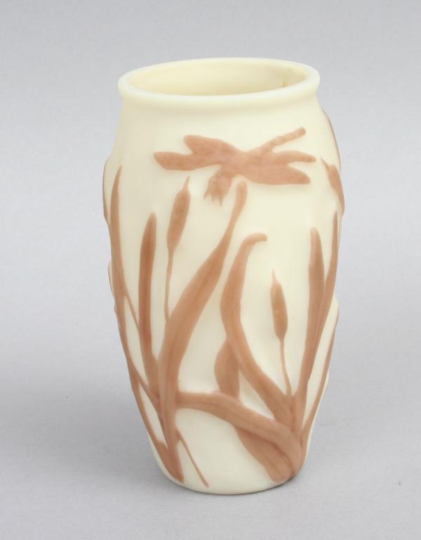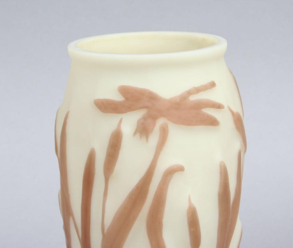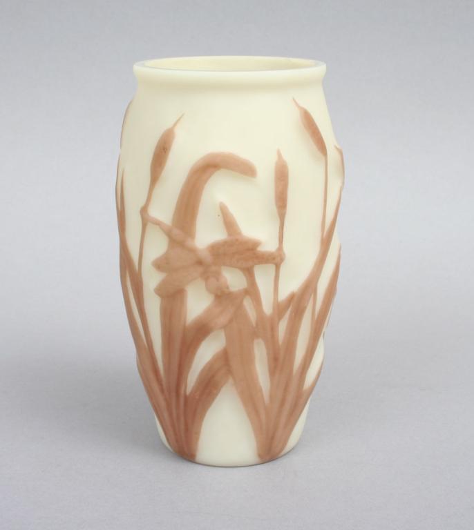 Phoenix Glass Company, molded in relief in cream colored glass with cattails and dragonflies. 6"H. Condition: tiny flak to rim,other wise very good, no damage or repair.