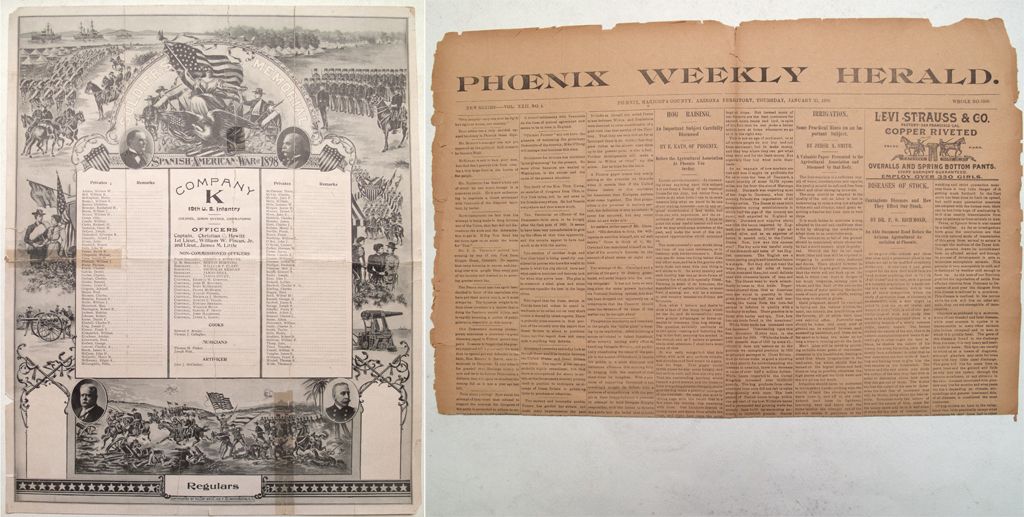 Article on the sheriff of Coconino committing flagrant outrages against the Navajo Indians. Also a large poster of Company K of the United States Infantry during the War of 1898. As with all old newspapers the paper is very fragile, but the historical value in articles and advertising is tremendous. Due to size, additional shipping fees may be required.