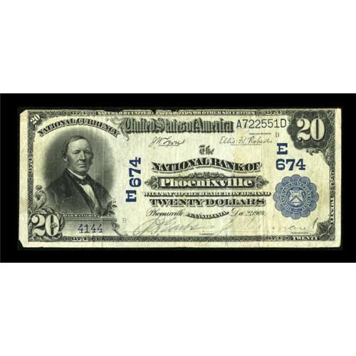 <B>Phoenixville, PA</B></I> - $20 1902 Plain Back Fr. 650 <B>The NB of Phoenixville</B></I> Ch. # (E)674<BR> A just plain scarce bank from which no large note has been available at public sale since 1994. <B>Fine,</B></I> with a couple of small chips out of the top margin and a tiny corner tip off. <BR><BR><b>Shipping:</b> Coins & Currency (<a target="_blank" href="http://www.heritageauctions.com/common/shipping.php">view shipping information</a>)