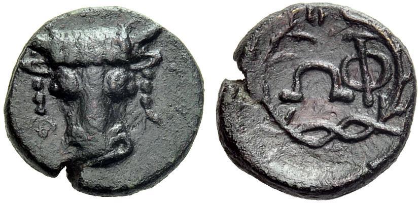 Phokis. Bronze, 370’s - 360’s BC. Æ 2.42 g., 7¢. Facing bull’s head. Rev. WF in wreath tying below. Seems to be unpublished with the retrograde ethnic. A split in the flan and the reverse slightly off-centre, otherwise with a nice green patina with some red on the reverse. Very fine.
